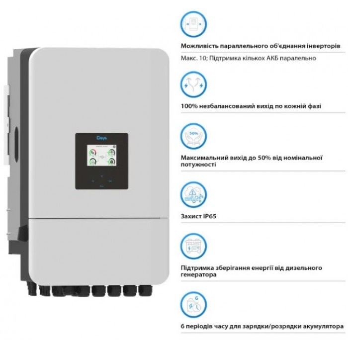 Ключовою особливістю гібридного інвертора Deye є його сумісність з наявними сонячними системами, що дозволяє підключати його до мережі змінного струму. Це робить його ідеальним вибором для модернізації старих установок, змінюючи їх на нові, більш ефективні, без необхідності повного капітального ремонту. Крім того, інвертор підтримує паралельне підключення до 10 одиниць, як для роботи від мережі, так і від автономної мережі. Така масштабованість має вирішальне значення для розширення можливостей сонячної енергетики у великих установках або поступового збільшення потужності за потреби. Крім того, цей пристрій може паралельно керувати кількома батареями, пропонуючи надійні рішення для зберігання та управління енергією.